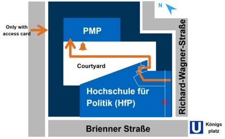 Access to the office of the Professorship of Mobility Policy (PMP) goes through the Brienner Forum through the Hochschule für Politik (HfP) at Richard-Wagner-Straße 1 (please ring the bell) or with access card via Augustenstr. 40.