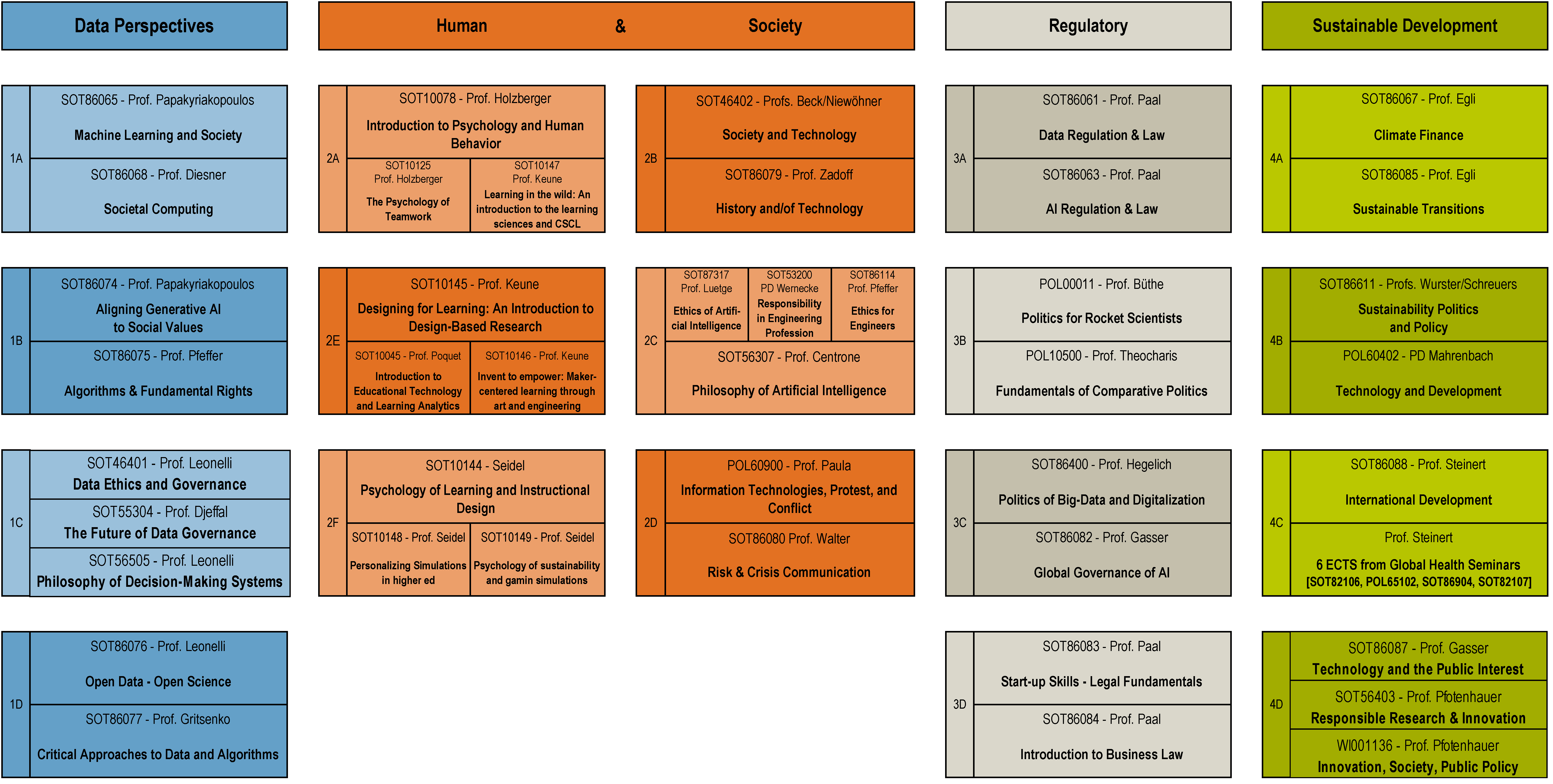 The program is flexible and stackable. At least 90 credits must be earned in elective modules. Of these, at least 12 credits must be earned in the elective area of "Method Orientation", at least 72 credits in the elective area of areas of "Specialization" and at least 6 credits in the elective area of "Application Project". In the elective area of specialization, elective modules from a total of six thematically related module blocks of 12 credits each must be completed, whereby at least one thematically related module block of at least 12 credits must be completed from each of the four specialization areas "Data Perspectives", "Human & Society", "Regulatory" and "Sustainable Development".